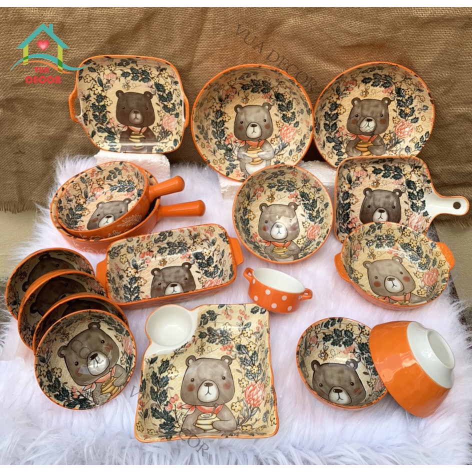 Bộ Chén Dĩa Sứ Bát Ăn Cơm Đĩa Sứ Dễ Thương Cute Bát Đĩa Gấu Cam Decor Cao Cấp S97 free ship
